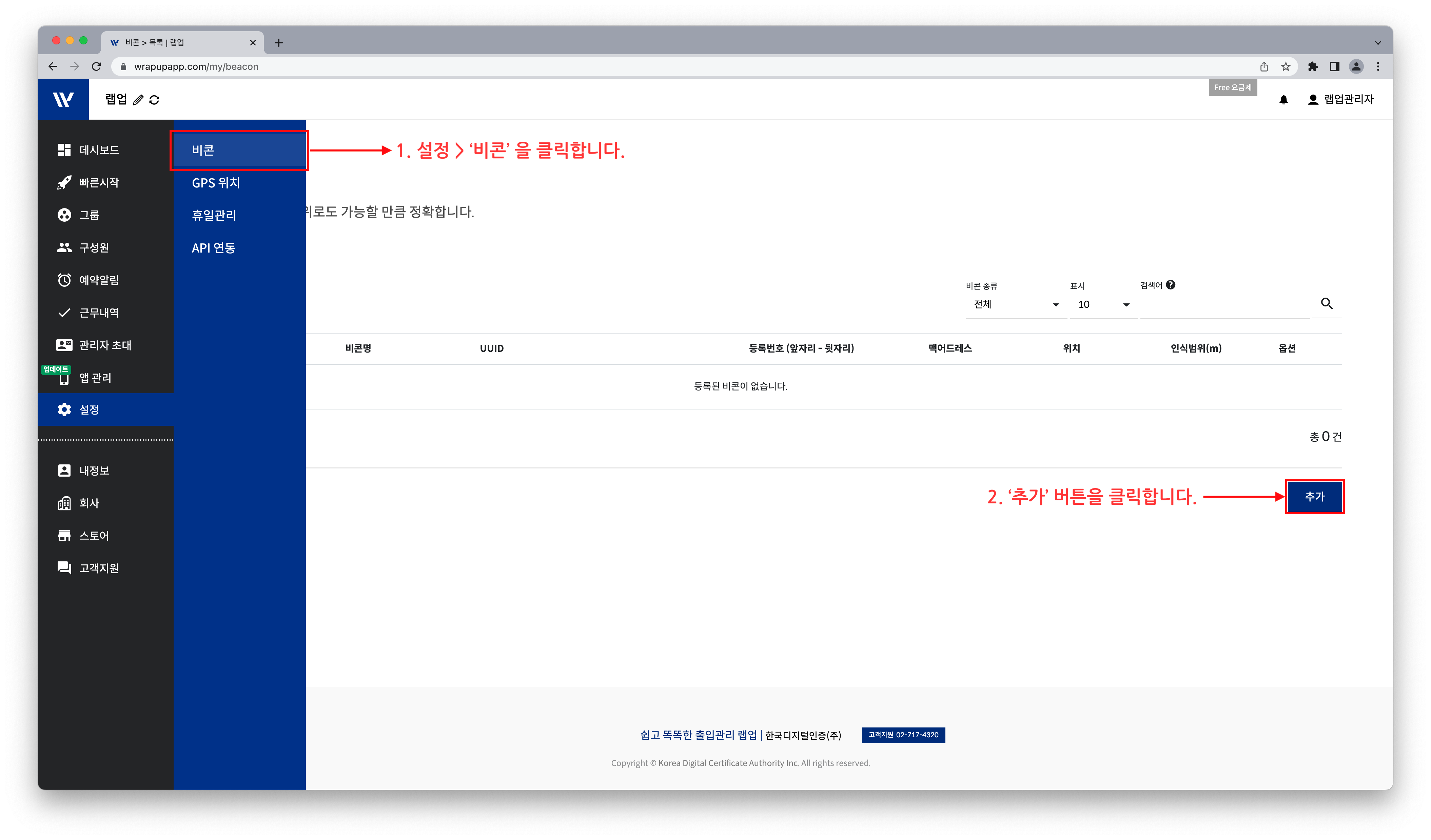 ‘설정’ -> ‘비콘’을 클릭합니다.